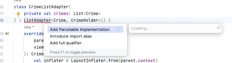 ListAdapter wants always to implement Parcelable. I don’t understand why, and in the book it’s not announced to do that.